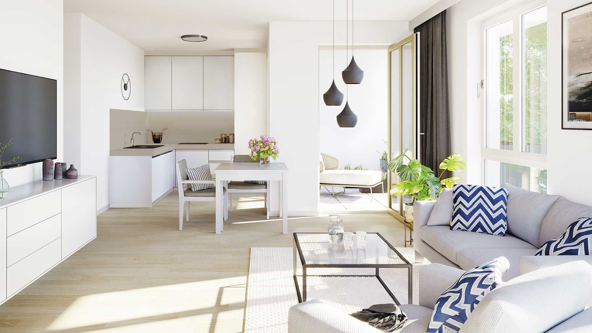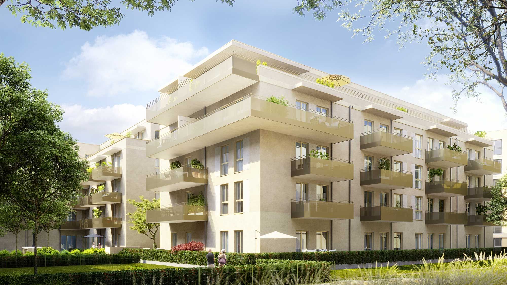Eine zeitlos moderne Architektur charakterisiert das Erscheinungsbild des neuen Service-Wohnens für Senioren im LUITPOLDVIERTEL. Liebevoll gestaltete Grünanlagen, ein quartierseigener Park und eine einladende Terrasse bieten viel Freiraum für Ruhe oder gemeinsame Unternehmungen.